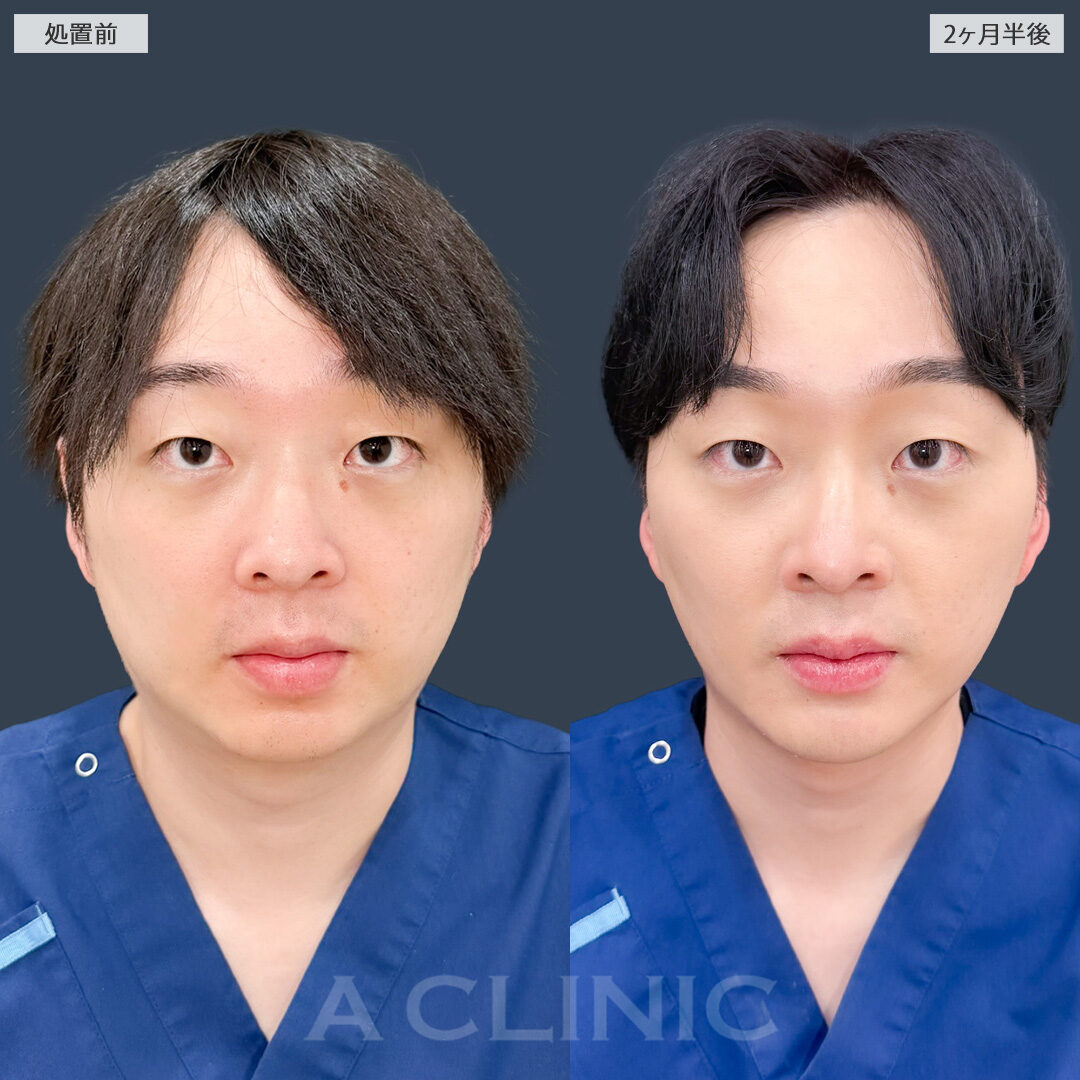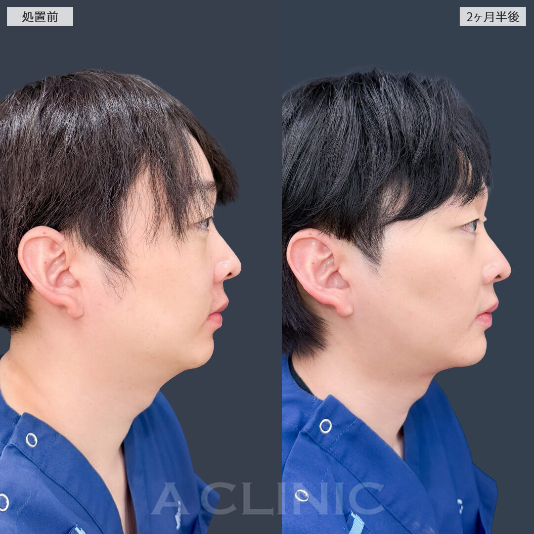 施術内容:脂肪を減らしたい箇所に合わせて目立ちにくい箇所に2~3mmほどの切開を加え、カニューレと呼ばれる細い管を用いて、脂肪細胞を直接吸引し、除去します。同時にAスレッド®と呼ばれる溶ける繊維をお顔の目立たない部分から皮下へ挿入し、皮膚を内側から引き上げて固定します。