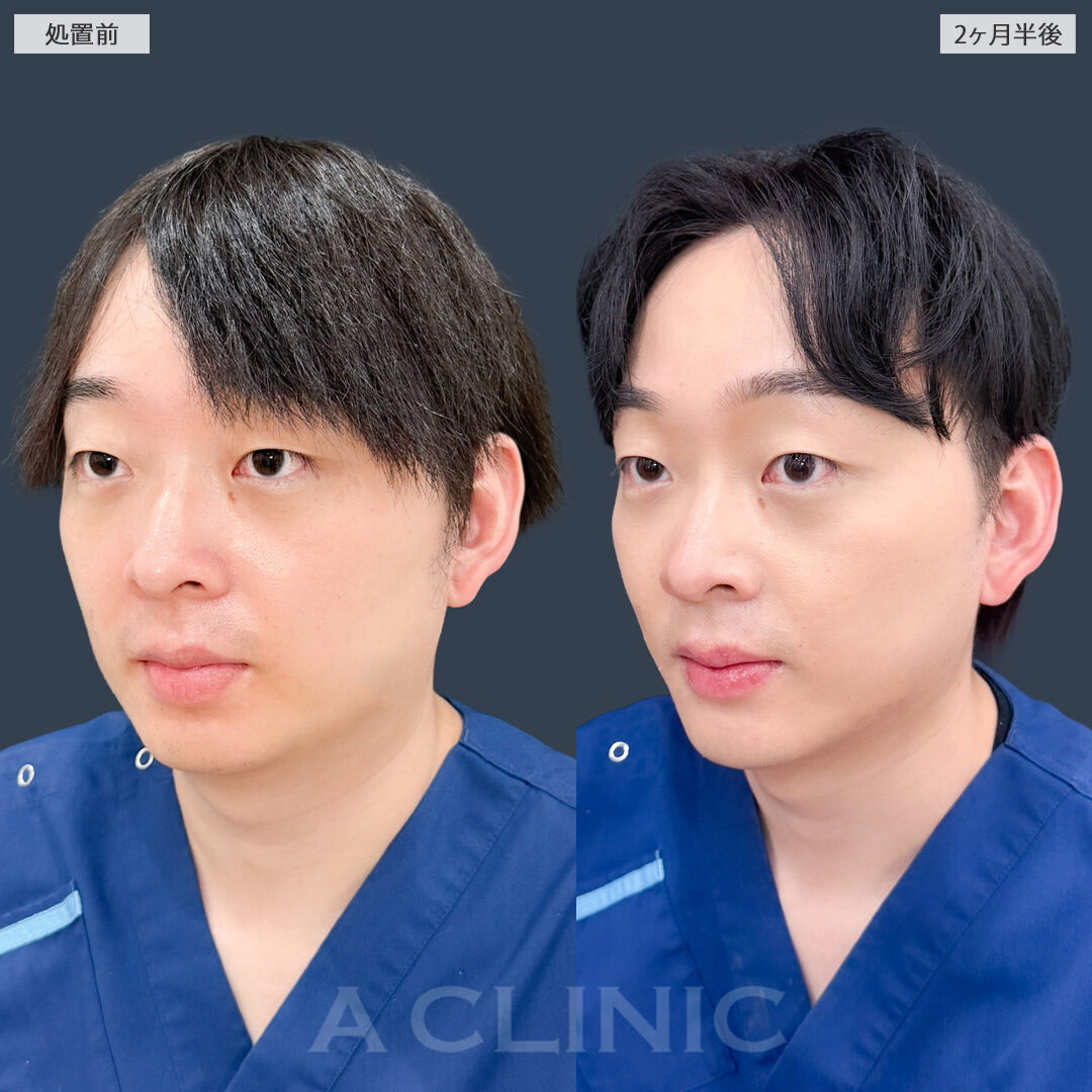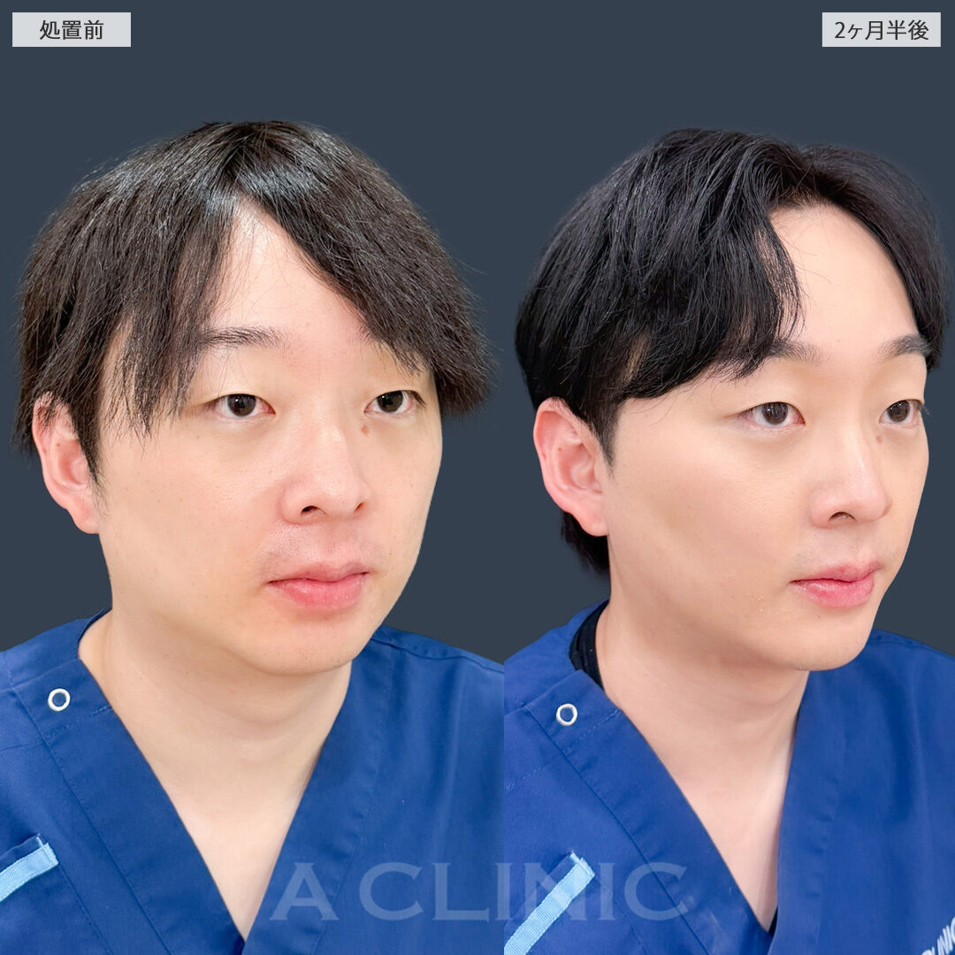 施術内容:ヒアルロン酸を皮下に注入することで、しわの改善やボリュームの増加、形の調整を行います。ヒアルロン酸は時間をかけて少しずつ体内に吸収されていきます。ヒアルロン酸の種類によって持続期間は異なります。注入時に麻酔液も入っているため、2〜3日でややボリュームがダウンします。