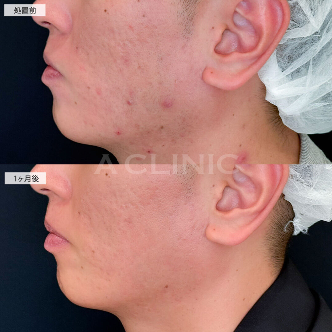 施術内容:サブシジョンとは毛穴やニキビ跡などでクレーター状になった肌の凹みを改善する治療です。皮膚の下にある固い繊維(瘢痕組織)を特殊な専用針で切ることで、肌の凹みを改善します。また、切った組織が修復される過程で肌の再生を促し、さらに凹みがなだらかになり目立たなくなります。A式美肌サブシジョンでは通常のサブシジョンの施術に加え、線維を切断・剥離した部分にヒアルロン酸を同時に注入することでクッションのような役割を果たし、再び皮膚と線維が癒着するのを防ぎます。