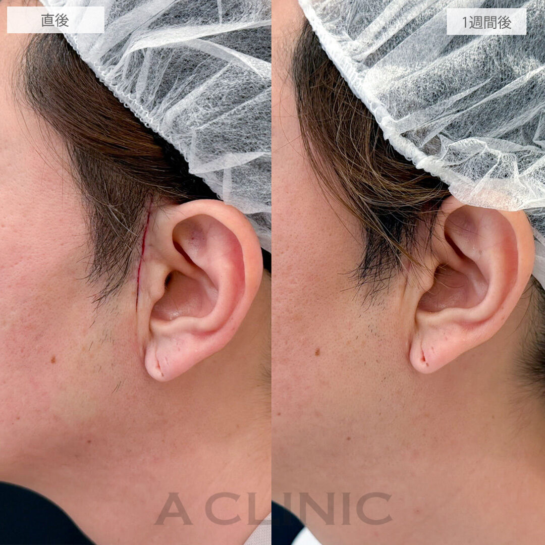 リスク、副作用:腫れ、内出血、疼痛、むくみなどが術後一時的に生じることがございます。また、稀に細菌感染症、左右差、色素沈着、感覚障害、運動障害、創離開、肥厚性瘢痕、創部陥凹、耳介偏倚、皮膚のよれ、繊維の突出などが生じることがございます。